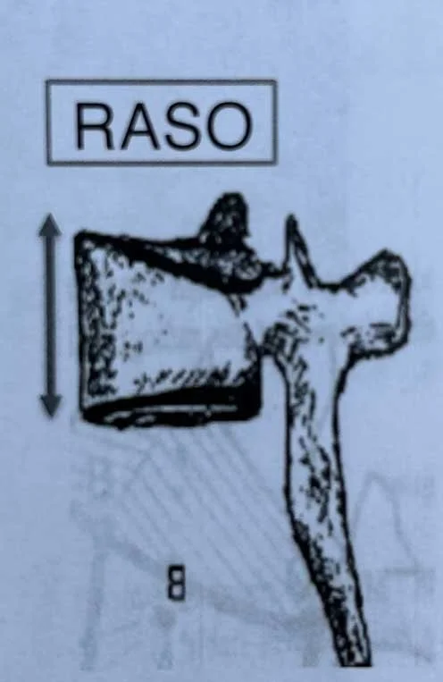 Now let’s loop back around to that “structural change in multiple vertebrae” we discussed before. However scoliosis initiates, what follows is vertebral deformity: the same vertebra deforms in all 3 planes of motion. In the sagittal plane, dorsal wedging is observed, meaning the anterior, or front, of the vertebra is wider than the posterior aspect. This is caused by a phenomenon coined RASO, an acronym for Relative Anterior Spinal Overgrowth.
