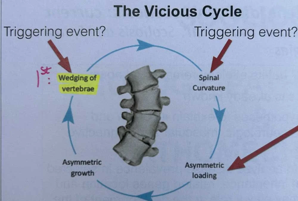 Most scoliosis professionals agree that the failure of the central nervous system to recognize this vicious cycle and control the asymmetries in the vertebra and spine are a large component of scoliosis progression, termed the Burwell Model of the Nervous System: Bi-Neuro-Osseous Timing of Maturation.²