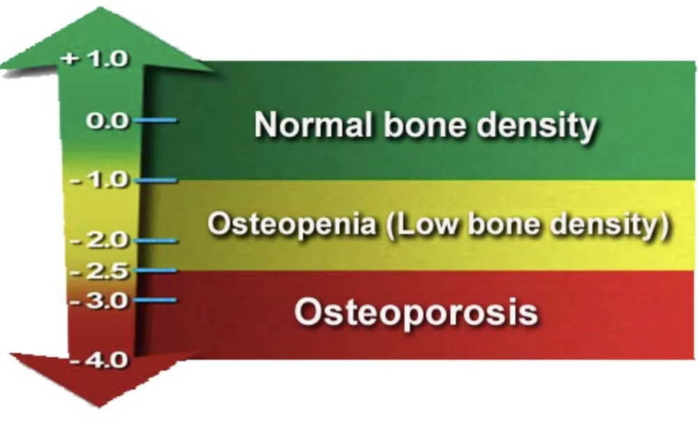 The hip, the spine, and sometimes the wrist will be scanned during a DEXA Scan. You will be given a “T-Score” for each part of the body scanned. If your T-Score is -1.0 or greater, your bone density is considered normal. If your T-Score is between -1.0 and -2.5, you have low bone density i.e. Osteopenia. If your T-Score is -2.5 or less, you have Osteoporosis, even if you have not yet broken a bone.